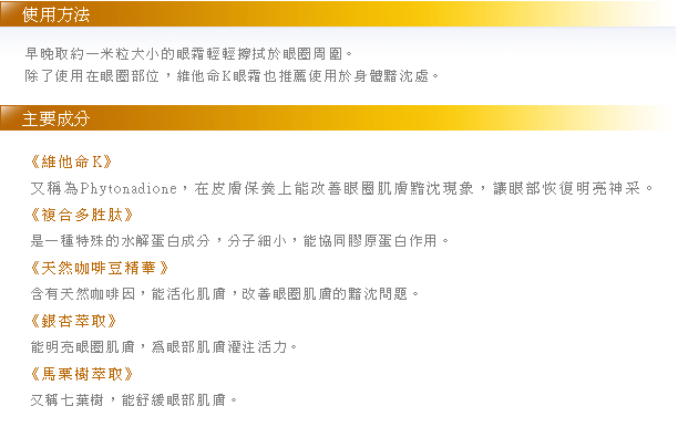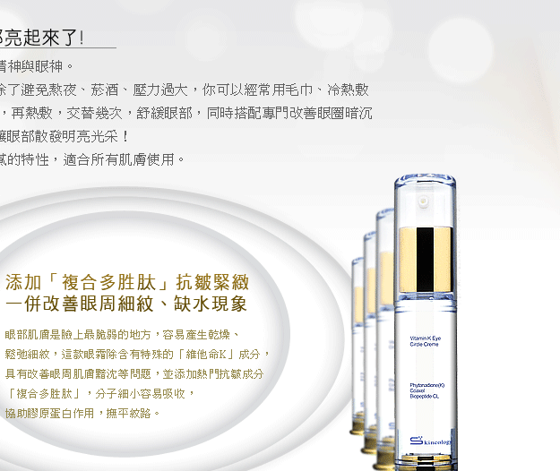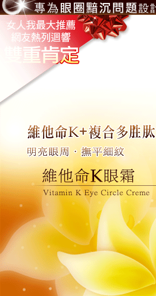 The wonderful eye creme has topical vitamin K to help heal bruises and darkness around the eye area. It is speacially formulated to penetrate deeply for maximum results.