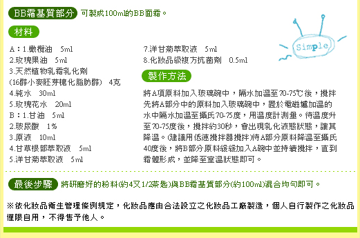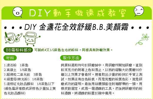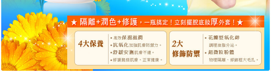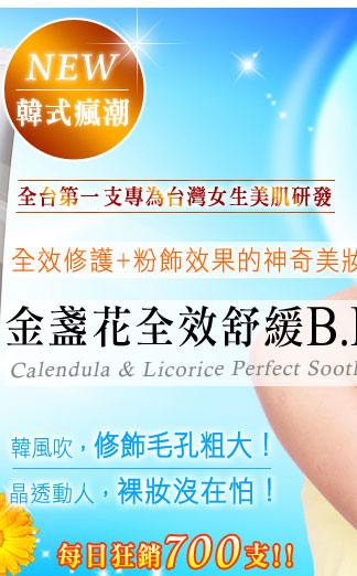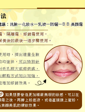 這款全新研發的B. B. 美顏霜,因為添加了多重修護保 養成分,同時擁有日霜、隔離霜及修飾霜的作用,能 同步修飾毛孔、痘疤等瑕疵效果,讓妳保養、修飾一 瓶搞定,即便使用後不再上粉底,也能展現如裸妝效 果般的素顏光采!