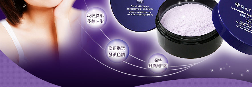 這一款細膚粉帶有淡淡的薰衣草精油香氣,內附的絨毛粉撲,接觸到肌膚上會有一種很幸福的感覺,由於淡淡紫色的透明粉質能夠吸收多餘的臉部油脂,同時又能修正肌膚黯沈發黃的色調,所以建議日間外出攜帶使用,讓妳隨時保持細滑乾淨又白皙的亮麗臉龐!