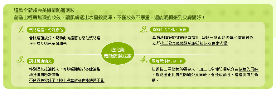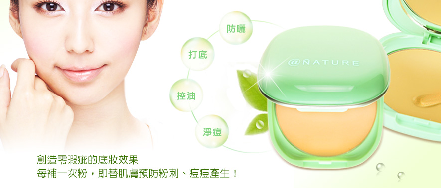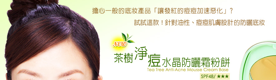 每天日間保養後,用內附海綿沾取適量霜粉餅(海綿可先沾上少許茶樹毛孔超淨化油脂調理露,再沾上霜粉餅,會具有更好的控油效果),均勻的塗抹在臉部肌膚上,依照臉頰、額頭、下巴的順序由內往外推開,有瑕疵處可特別再多加強一遍,具有修飾膚色及抑止油光過度分泌的效果。 |