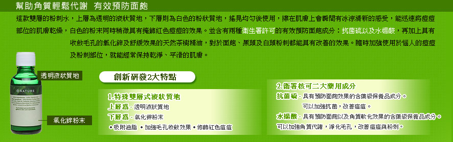 本產品含有水楊酸,使用後應注意加強防曬,避免直接日曬,遇有過敏刺痛現象發生時,應停止使用。 本產品僅適合局部面皰使用,不得長期使用接觸於皮膚,三歲以下嬰兒不得使用。 | | | |