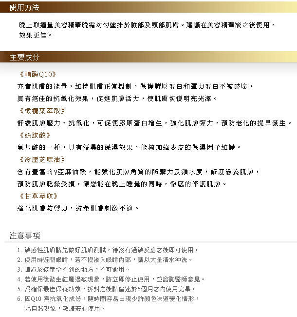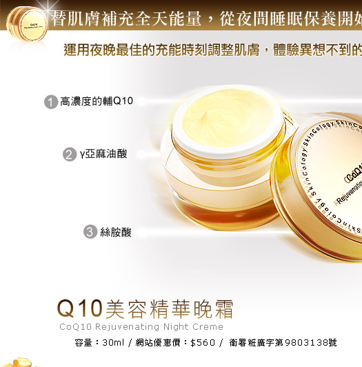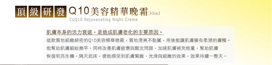 This super CoQ10 night creme is expertly blended with natural CoQ10 patented technology, cold pressed sesame oil, olive leaf extract, licorice and serine for maximum therapeutic benefits and effective wrinkle defense.