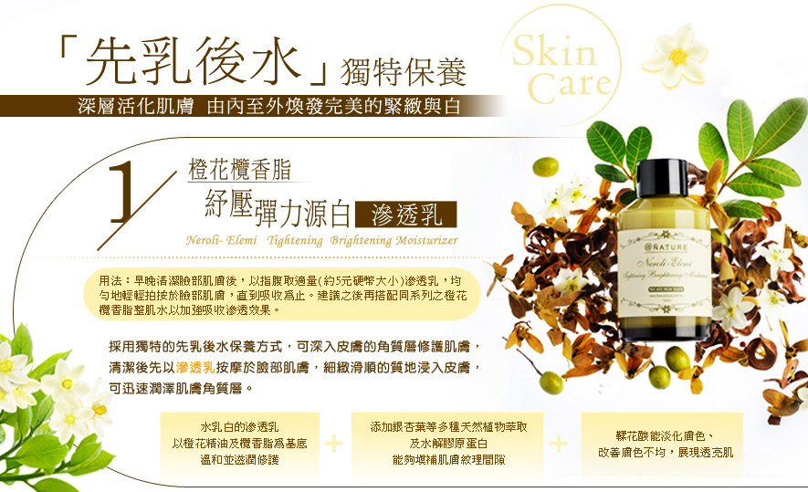 | Nature Neroli-Elemi Tightening Brightening Moisturiser 120ml This moisturizer contains a special, natural botanical extracts - Elemi, which can stimulate your skin firm cells, provide a natural lifting effect of the face. Based on the pure essencetial oils - Neroli and Elemi, this product can repair and moisten your skin. Moreover, it is formulated with Acetyl Hexapeptide-3, Palmitoyl Pentapeptide-3 and Vitamin E derivates for firming and lifting benefits. Directions: After cleansing the face day and night, apply appropriate amount of the moisturizer to face and neck, the advanced formula can help boost skin's elasticity for a visibly smoother, firmer appearance. Ingredients: Purified Water, Carbomer, Cyclopentasiloxane, Butylene Glycol, Hydrogenated Polyisbutene,Isopropyl Isostearate, PEG-8, Polysorbutene 60, Trictannoin, Cabbage Rose Water, Glycerin, Behenyl Alcohol, Hyaluronic acid, Glycine, Glycerly Stearate & PEG-100 Stearate, Dimethicone, Olive Oil, Echinacea Purpurea Extract, Paeonia Officinalis Flower Extract, Ellagic Acid, Sorbitan Oleate, Ginkgo Biloba Leaf Extract, Methylparaben, Tocopheryl Acetate, Soluble Collagen, Dimethyl Isosorbide, Xanthophyll, Triethanolamine, Canarium Commune Gum Oil, Serine, Allantoin, Propylparaben, Bisabolol, Bambusa Vulgaris Shoot Extract, Palmitoyl Pentapeptide-4, Acetyl Hexapeptide-8, Methylisothiazolinone, Lavender Oil, Ascorbyl Glucoside, Chamomile Oil, Xathan Gum, Orange Flower Oil, Ylang Ylang Oil, Rosewood Oil. Kindly note that the Domestic non standard mail consist of S$1.50 postage plus Registered mail S$2.50(with tracking no. provided and its highly recommended as there will be no refund, exchange of products for loss or damage due to Domestic standard mail). Please advise mailing address after payment made. |