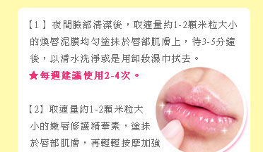 適用膚質:所有膚質,特別推薦唇部暗沈、色素沈澱、易脫皮及唇肌粗糙的人使用。 |