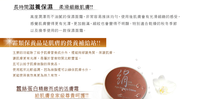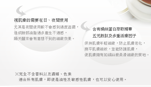 This super fine silk protein cream adds additional micro-layers of moisture to pretect and enhance the elasticity and ressilience of your skin and impart a smooth texture. It is not a simple cover-up or moisturizer but specially developed to reduce fine lines and facial wrinkles. It imparts an amazing feel on the skin, forms a velvety soft, matt finish.