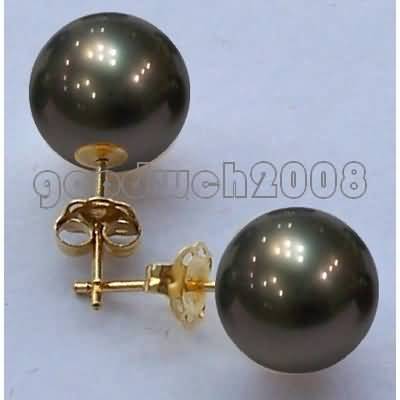 18k Yellow Gold 12MM Tahitian Black Pearl Stud Earrings, the fashion & classic hand made fine jewelry for wedding, birthday, anniversary.