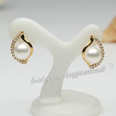 Shell Shaped White Pearl Diamonds Stud Earrings Yellow Gold Wedding