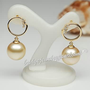 Circle Shaped Solid Yellow Gold Cultured Akoya South Sea Golden Pearl & Diamonds Dangle Earrings, the fashion & classic hand made fine jewelry for wedding, birthday, anniversary.