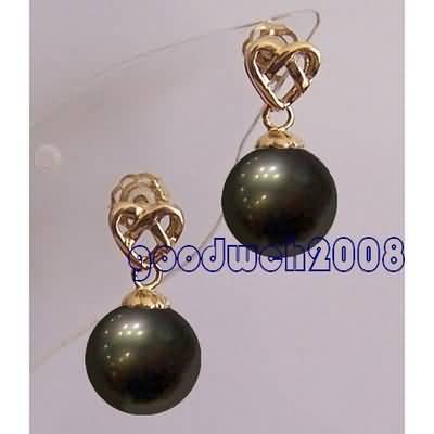 9MM Black Pearl Post Drop Earrings Heart Shaped Yellow Gold
