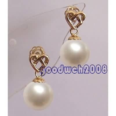 9MM White Pearl Post Drop Earrings Heart Shaped Yellow Gold