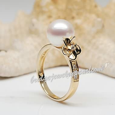 Flower Shaped Yellow Gold Akoya White Pearl Diamonds Ring, resizable, size 4 size 5 size 6 Size 7 size 8 size 9 size 10, the fashion & classic hand made fine jewelry for wedding, birthday, anniversary.