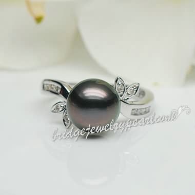 Leaf Shaped White Gold Akoya Black Pearl Diamonds Ring, resizable, size 4 size 5 size 6 Size 7 size 8 size 9 size 10, the fashion & classic hand made fine jewelry for wedding, birthday, anniversary.