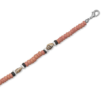 This brand new anklet is a 9" anklet with a 1" extension and a lobster clasp closure. It features pink colored coco wood beads and it is accented with Nassa Tiger shells, brown coco wood beads and white coco wood beads!