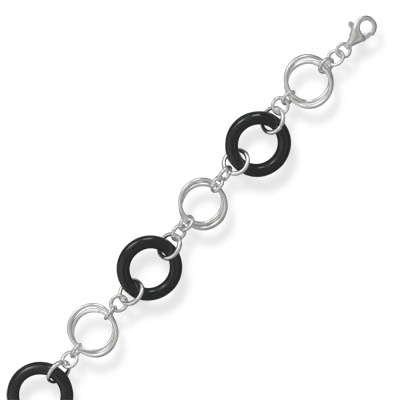 This brand new bracelet is a 7.5 inch genuine .925 sterling silver bracelet featuring alternating genuine black onyx open rings and genuine double polished .925 sterling silver rings. The black onyx rings are 15 millimeters each and the polished .925 sterling silver rings are 10 millimeters each.