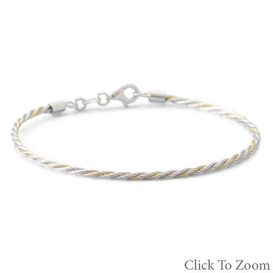 This bracelet is a brand new 7.5" rhodium plated genuine .925 sterling silver and 14 karat gold plated sterling silver 1.5mm cable twist bracelet with a lobster clasp closure.