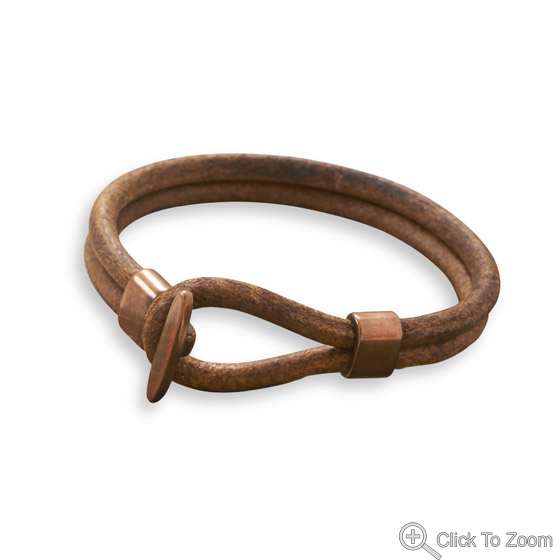 This brand new gentlemen's bracelet is both handsome and unique! This 9 inch bracelet is a rustic style double strand design fine brown leather bracelet with a copper T bar style closure. Perfect for daily wear and yet fine enough to be worn with dress attire, this unique bracelet makes a great addition to any gentleman's jewelry collection!