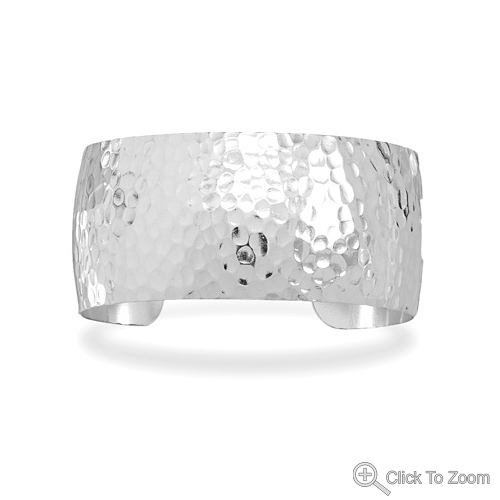 This brand new bracelet is a 7 inch cuff style bracelet in solid genuine stamped .925 sterling silver measuring 1.25 inches wide with a hammered finish. Perfect with nearly any attire, this hammered cuff bracelet is an excellent addition to any fine silver jewelry collection.