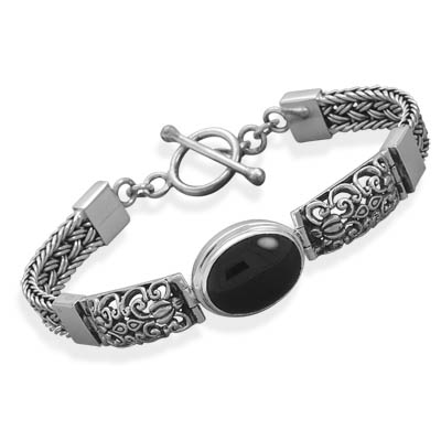 This brand new bracelet is a 7.5" handcrafted Bali design bracelet in a genuine .925 sterling silver Filigree design, with a unique toggle style closure and it features an oval shaped genuine black onyx stone measuring 15 millimeters by 12 millimeters! This is one exquisite bracelet that is sure to be noticed and admired whenever it is worn!