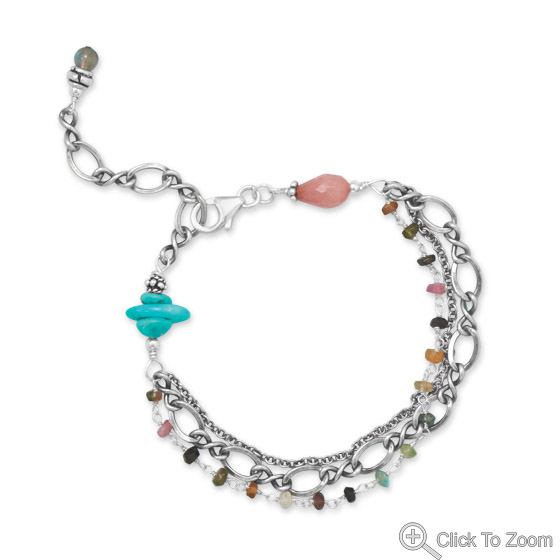 The bracelet consists of a strand of dainty, faceted multicolor genuine tourmalines linked together on a genuine .925 sterling silver wire, a strand of oxidized cable chain and a strand of oxidized figure eight chain. Turquoise chips and a 6mm x 9mm dyed jade briolette accent the bracelet.