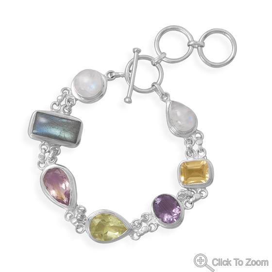 This spectacular bracelet is one of the finest examples of multistone bracelet designs you'll ever see and it is sure to be noticed and admired whenever it is worn! This brand new bracelet is a 7.5 inch bracelet with a 1 inch extension in genuine .925 sterling silver with a toggle style closure and a beautiful double link design. This multistone toggle bracelet features genuine Rainbow Moonstone, Amethyst, Citrine, Lemon Quartz, Ametrine and Labradorite stones! This is a bracelet anyone would be proud to own and wear!