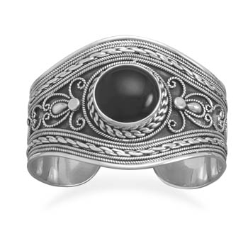 Ornate Sterling Silver Cuff Bracelet with Black Onyx
