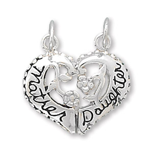 This brand new genuine .925 sterling silver heart shaped charm measures 19 millimeters by 15 millimeters. It features two intricately scrolled, cut-out flowers in the center of the heart with the word "Mother" stamped on one side of the heart and the word "Daughter" stamped on the other! In addition, this beautiful charm features a unique double bale design so that it will sit evenly on your necklace or you can "break" the charm into two seperate pieces so that mother can wear one half of the heart charm on her necklace while daughter wears the other half on hers! The perfect gift idea for mother, daughter or both!