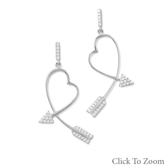 These beautiful earrings are brand new rhodium plated genuine .925 sterling silver post back earrings with a heart arrow design featuring Signity CZs! The heart measures 15 millimeters by 10 millimeters and the CZs are 1 millimeter each.