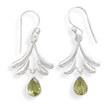 Fan Design Sterling Silver French Wire Earrings with Peridot Drop