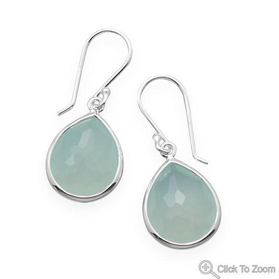 These brand new earrings are Rhodium plated sterling silver french wire earrings with pear shape freeform faceted green chalcedony drops. The chalcedony drops measure approximately 13 millimeters by 15 millimeters and the earrings hang approximately 31 millimeters.
