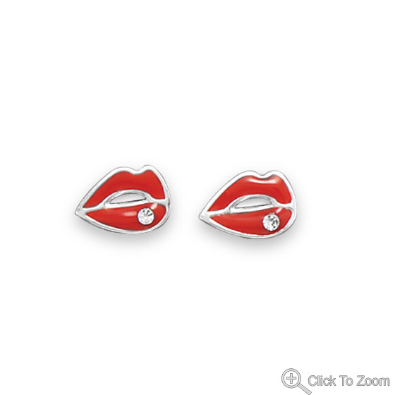 These cute little studs are brand new 6 millimeter by 9 millimeter genuine .925 sterling silver stud earrings featuring bright red enamel lips with a clear crystal accent!
