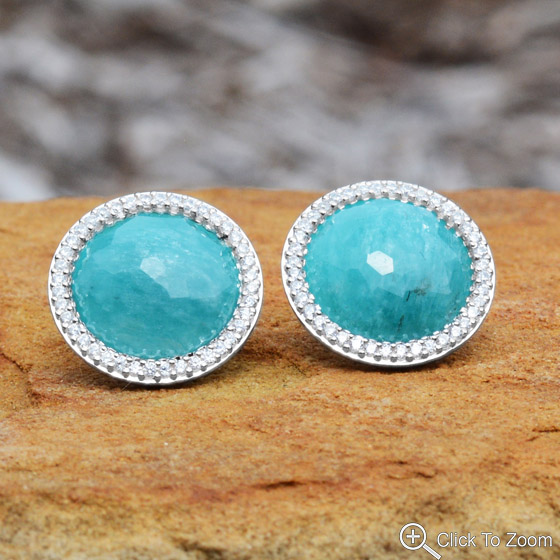 These stunning earrings are brand new rhodium plated genuine .925 sterling silver post earrings with round freeform faceted amazonite stones and a cz edge design! These beautiful earrings measure approximately 15.5 millimeters.