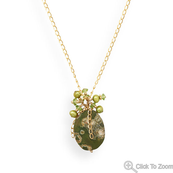 This handmade necklace is a brand new 20 inch long 14/20 gold filled necklace with pendant drop. The oval rhyolite (also known as rainforest jasper) drop measures approximately 20mm x 26mm, and is adorned with shimmering lime cultured freshwater pearls and peridot rondelles. This necklace features a lobster clasp closure.
