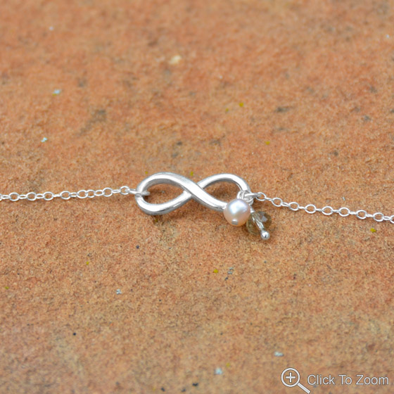 ​Handmade in Austin, Texas using the finest American or imported materials. Includes a personally signed card by the designer who crafted the bracelet! This brand new handmade bracelet is a genuine .925 sterling silver chain link bracelet with a lobster clasp closure. This is a 7 inch bracelet with an additional 1 inch extension chain and it features a genuine .925 sterling silver infinity symbol with a pink cultured freshwater pearl measuring 5 millimeters to 6 millimeters, and a 4 millimeter smoky bi-cone crystal.