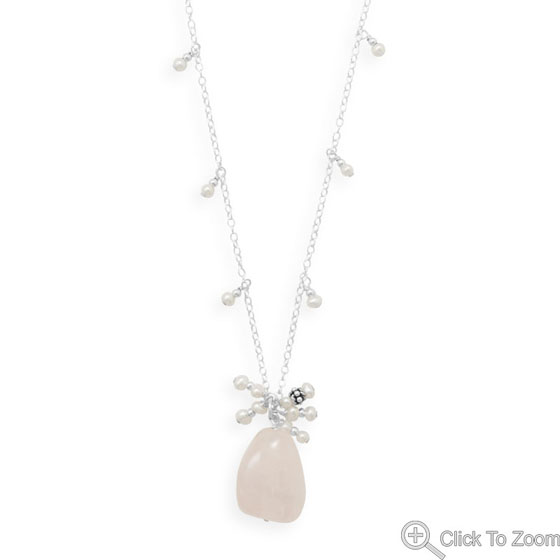 This brand new handmade genuine .925 sterling silver chain necklace features delicate cultured freshwater pearl dangles spaced along the chain and a rose quartz drop. Silver beads and cultured freshwater pearls are gathered around a free form pale rose quartz nugget, measuring approximately 14mm x 19mm. This necklace has a spring ring closure.