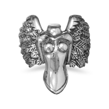 This brand new men's gothic style ring is an oxidized white brass headless angel ring. The angel is 30mm long, with the wings wrapping to form the band. The wings taper to a 7.5mm wide polished band. This ring is available in whole sizes 7-13. All buyers are contacted upon payment verification to confirm their desired ring size prior to shipping and international buyers are welcome to contact us for a ring size conversion chart to determine their correct corresponding ring size.