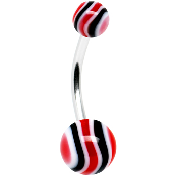 This brand new radical hypnotic belly button ring is a 14 gauge (1.6mm) navel ring in a high-polish 316L surgical grade stainless steel design. This curved bar style navel ring has a total length of 11 millimeters (7/16") and it features a round 5 millimeter red and black acrylic top hypnotic ball end and a round 8 millimeter red and black acrylic bottom hypnotic ball end! Unique and commanding, this mesmerizing acrylic belly ring will set you apart from the rest!