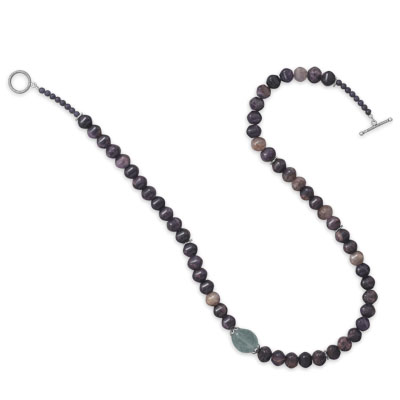 This brand new necklace is a 24 inch necklace with genuine Amethyst lantern beads measuring approximately 10 millimeters! This beautiful necklace also has 4 millimeter purple colored agate beads and genuine .925 sterling silver Bali design spacer beads with an oxidized finish! In addition, this lovely necklace features a magnificent genuine Flourite nugget measuring approximately 16 millimeters! Finishing off this beautiful necklace design is an elegant genuine .925 sterling silver toggle clasp style closure with an oxidized finish!