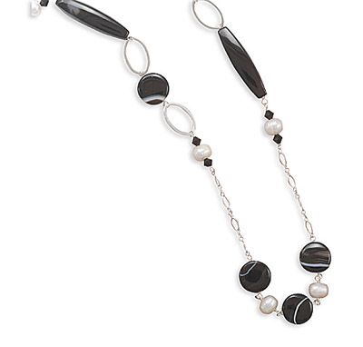 This brand new necklace is a 36 inch genuine .925 sterling silver necklace with a lobster clasp closure and it features genuine 8 millimeter cultured freshwater pearls, 5 millimeter crystals, 14 millimeter coin shape banded black onyx and 41 millimeter oblong banded black onyx. Elegant and sophisticated, this beautiful necklace makes an excellent addition to any fine jewelry collection!