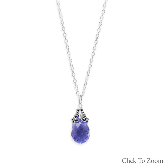 This brand new necklace is a 16 inch genuine .925 sterling silver necklace with a spring ring closure and it features a gorgeous purple glass briolette drop! The 10 millimeter by 17 millimeter glass drop has an ornate oxidized finish .925 sterling silver bali cap.