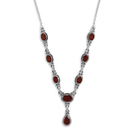 This brand new necklace is a 15.5 inch necklace with a 1.5 extension genuine .925 sterling silver oval and pear shape garnet drop necklace. This necklace features six, 4.5 millimeter by 6.5 millimeter oval shaped garnets, one 7.5 millimeter by 9 millimeter oval shaped garnet and a 5 millimeter by 8.5 millimeter pear shape drop!