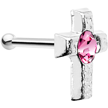 This brand new nose stud features a genuine .925 sterling silver cross on a 316L surgical steel straight nose bone. This beautiful sterling silver cross design nose stud features a round brilliant pink colored genuine Swarovski crystal.