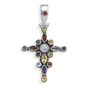 This magnificent cross pendant is genuine .925 sterling silver and it measures 51.5 millimeters by 30.5 millimeters. This multistone cross has a 5.5 millimeter round moonstone center stone, with marquise shaped stones measuring 7 millimeters by 3.5 millimeters, and round 3.5 millimeter stones! The stone selection on each individual cross may vary slightly, making your cross both a unique and a one of a kind cross, and the selection of stones may include amethyst, blue topaz, citrine, garnet, iolite, peridot and smoky quartz!