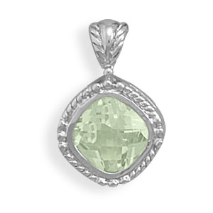 This brand new pendant is a genuine .925 sterling silver and rhodium plated oval pendant measuring 21 millimeters by 13 millimeters and it features a stunning tangy green apple colored genuine faceted amethyst! This beautiful pendant is sure to enhance any attire!