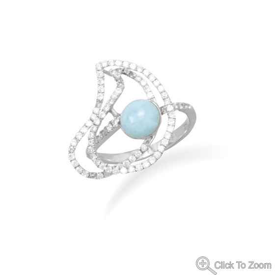 This spectacular ring is a brand new rhodium plated genuine .925 sterling silver ring with an abstract CZ design and a 7 millimeter round genuine larimar stone. The abstract design is approximately 21 millimeters by 22 millimeters. The top portion of the band is accented with CZs. The band measures 2.5 millimeters wide and this ring is available in whole sizes 6, 7, 8, 9 and 10 (US)