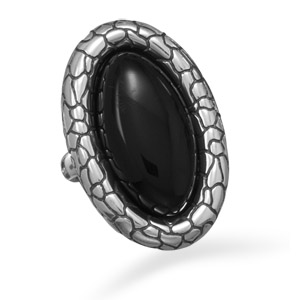 This brand new ring is a genuine stamped .925 sterling silver ring with an oxidized finish to enhance the stylish cobblestone design and it features a genuine oval black onyx center stone measuring approximately 10.5 millimeters by 23 millimeters. The entire top design area of the ring measures approximately 21 millimeters by 30 millimeters and this ring is available in whole sizes 6, 7, 8, 9 and 10.