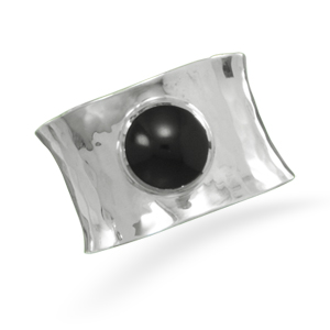 This brand new ring is a genuine stamped .925 sterling silver ring with a tapered concave band in a hammered finish that measures approximately 14 millimeters wide at the top and gradually tapers down to 10 millimeters wide at the bottom of the band. Featuring a round 8 millimeter genuine black onyx center stone, this stylish ring is sure to be noticed and admired whenever it is worn! Available in whole sizes 6, 7, 8 and 9 (US)