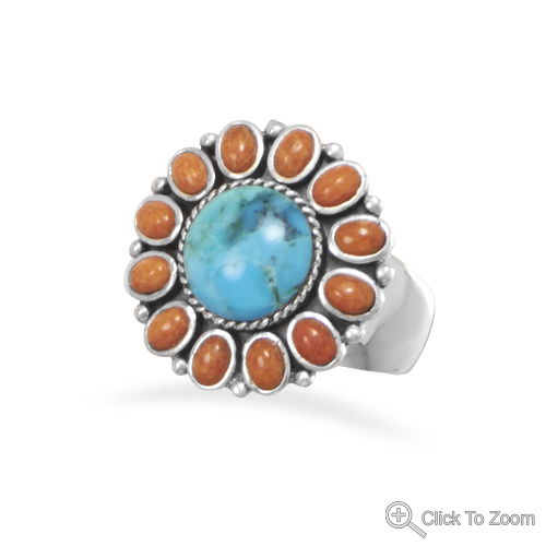This brand new sunburst design ring is sure to put a smile on your face whenever you put it on! This ring has a genuine .925 sterling silver band and it features a magnificent sunburst design with a round 10 millimeter genuine turquoise center stone that is surrounded with genuine orange coral stones measuring approximately 2.5 millimeters by 4 millimeters each! Available in whole sizes 6, 7, 8, 9 and 10, this gorgeous ring is destined to become a favorite piece in your entire jewelry collection!