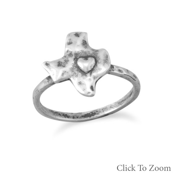 This unique ring is a brand new oxidized genuine .925 sterling silver Texas ring with a textured finish and a heart design! Texas measures approximately 12 millimeters by 13 millimeters and the band measures 1.5 millimeters wide. This "Deep in the Heart of Texas" ring is available in whole sizes 4-10 (US)