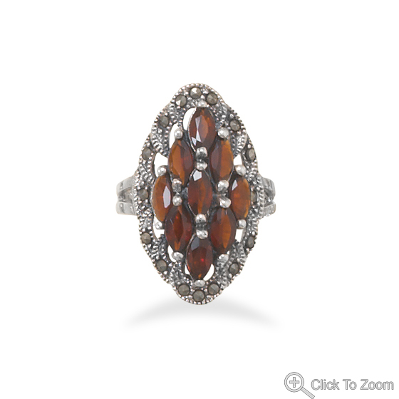 This brand new ring has a genuine .925 sterling silver band with a total top design area measuring 18 millimeters by 25 millimeters and it features genuine Marcasite around the outer edge with nine genuine Garnet stones measuring 2 millimeters by 4 millimeters! This beautiful ring is available in whole sizes 6-9. All buyers are contacted upon purchase verification to confirm desired ring size prior to shipping.