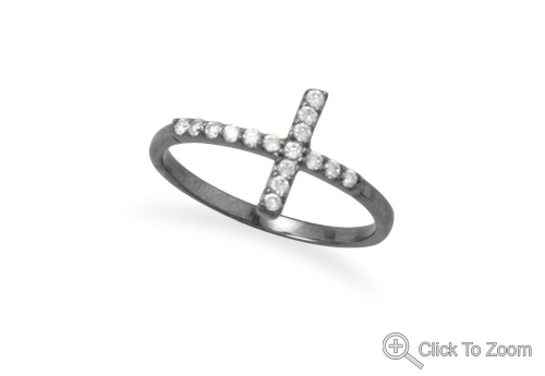 This unique brand new ring is a dark ruthenium plated genuine .925 sterling silver ring with a sparkling clear cz encrusted sideways cross design! The cross measures approximately 10 millimeters by 15 millimeters and the band is 1 millimeter wide. This ring is available in whole sizes 4, 5, 6, 7, 8, 9 and 10 (US)